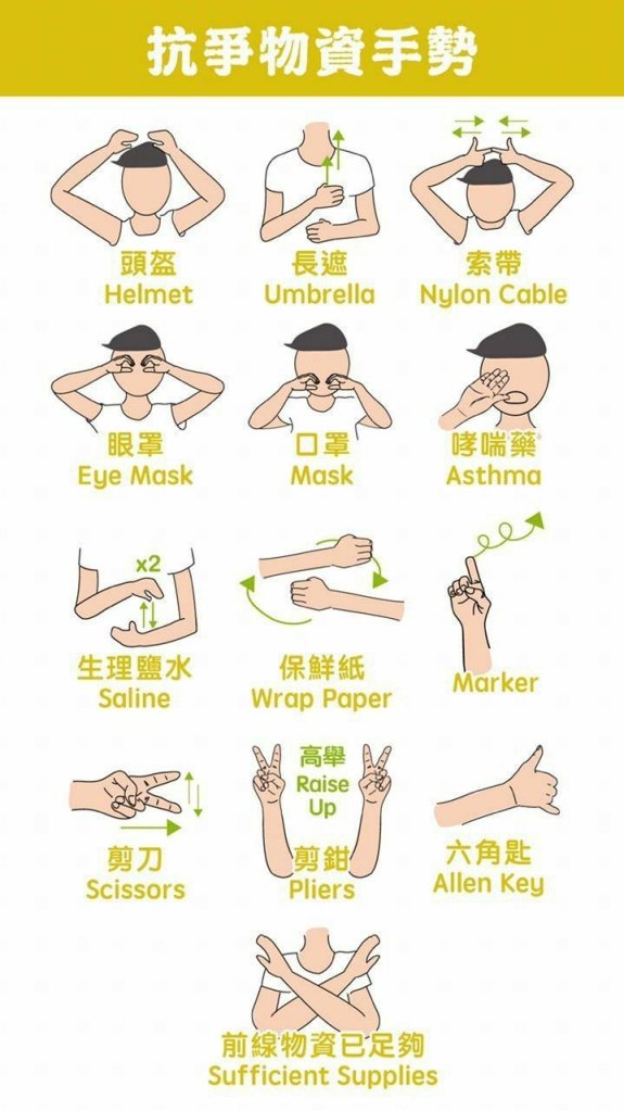- Supply lines and hand signals. From past experience with the protests in 2014, protesters learned exactly the kind of supplies would be needed at the front lines of conflict with the police. As such, they invented an elaborate set of hand signals that could be used to ripple backward to supplies in the rear of a crowd so they could be deployed quickly at the front.