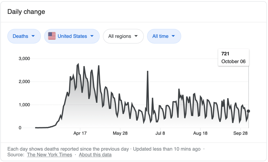 The retrograde wing of the conservatives in the country are counting on divine providence, and honestly, that kind of belief in Godly interference is incredibly persistent with a poorly understood phenomenon. But the Left is going to have to reconcile to coherence that “we hate you because you won’t wear a mask/we’re saved because everyone wore a mask” when double the numbers of people don’t die by Christmas.