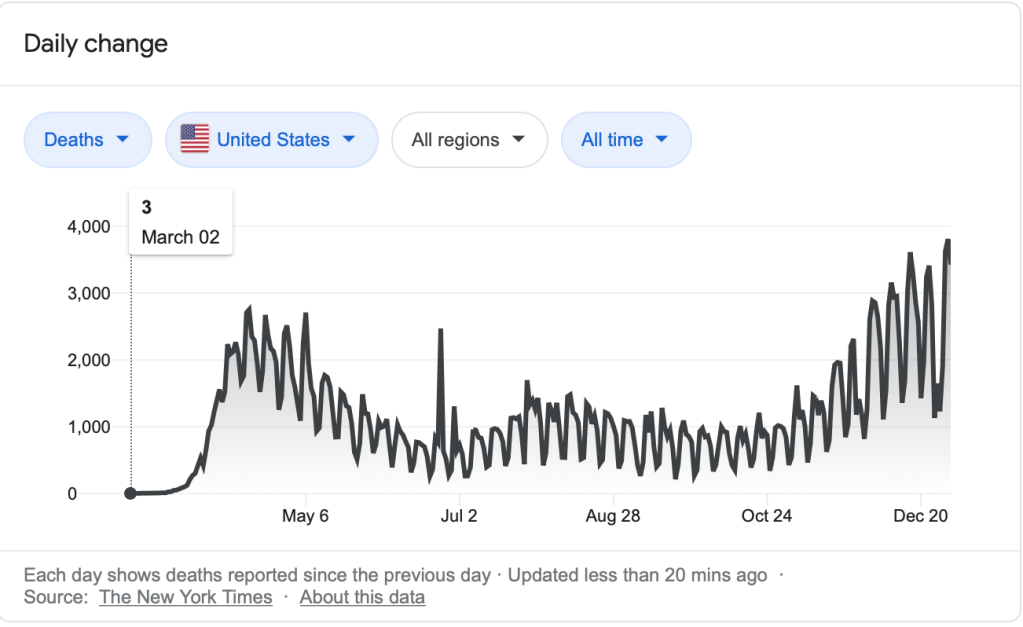 And the problem is this kind of innumeracy has been coming fast and furious with the COVID crisis. How many people have heard the equivalence “We’ve lost more people to COVID than we did during all of WWII”? This factoid is actually true — we did lose something like 250K troops in fighting in both the European and Pacific Theaters. But it is a meaningless, manipulative equivalence. Approximately 7.7K people die every day in the US under normal circumstances (more than 2 9/11s! if I wanted to be histrionic) — but it’s a meaningless statistic. It counts on the preying on the fear, and distorting the response of the person subject to it. In all things that matter — national sacrifice, governing mood of the populace — comparing COVID to WWII is a psychopathic manipulation, whether intentional or not.